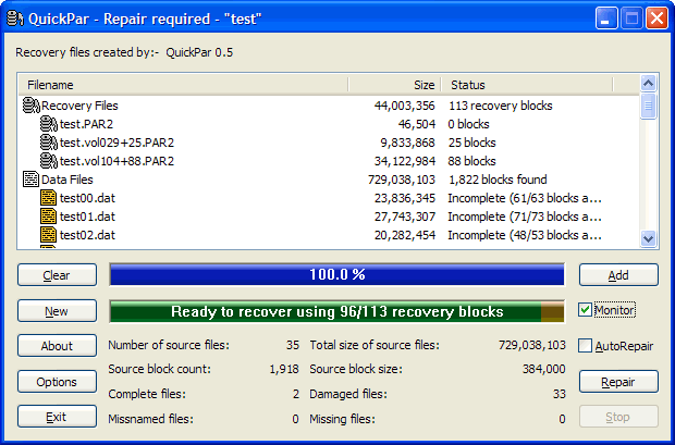 You will see that two PAR2 files have been obtained with a combined total of 113 recovery blocks and the QuickPar now indicates that repair is possible (using 96 of the available recovery blocks). You should click the "Repair" button to start the repair.